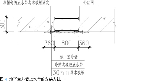 方法一:地下室外墻需安裝止水帶的部位,應在止水帶背面配30mm 厚木模板,木模板的寬度和長度應滿足止水帶安裝的要求,木模板應與地下室外墻整體模板(鋼模、竹模等)連接成一體,以防澆筑混凝土時木模板移位、漏漿,失去止水作用。同時用212 in(1in=25mm)雙帽釘將外貼式橡膠止水帶與木模板固定(將雙帽釘釘在止水帶兩側邊緣部位,每隔200mm 釘雙帽釘一個)。安裝好的止水帶應平整,無下垂現象。此部位在澆筑混凝土后,混凝土強度達到設計強度的80%以上方可拆模,拆摸后再粘貼卷材防水層。如圖4 所示。