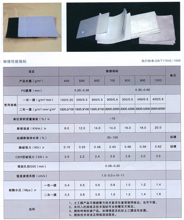 復(fù)合土工膜是由土工布為基材、高分子材料等(如PE膜、EVA等)為膜材兩種以上的材料復(fù)合而成的土工合成材料。它以土工織物為導(dǎo)水層,以高分子材料為防滲層,經(jīng)壓延、熱溶涂敷而成,該生產(chǎn)工藝既保持了土工基布的良好力學(xué)性能,又使復(fù)合產(chǎn)品薄膜厚度均勻,剝離強(qiáng)度高,避免了薄膜上氣孔、砂眼的形成,大大的提高了膜的抗?jié)B強(qiáng)度,薄膜表面采用壓花處理,增加了成膜的摩擦系數(shù),既提高了防滲工程的穩(wěn)定性,又方便了施工。該產(chǎn)品幅寬3-6.0米。